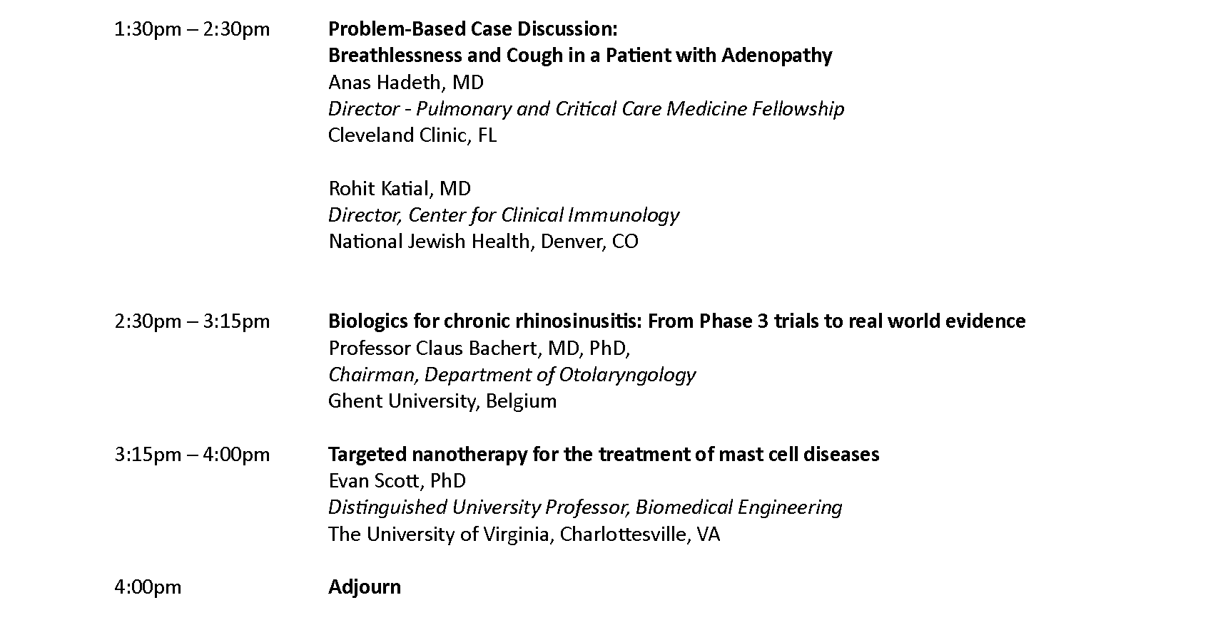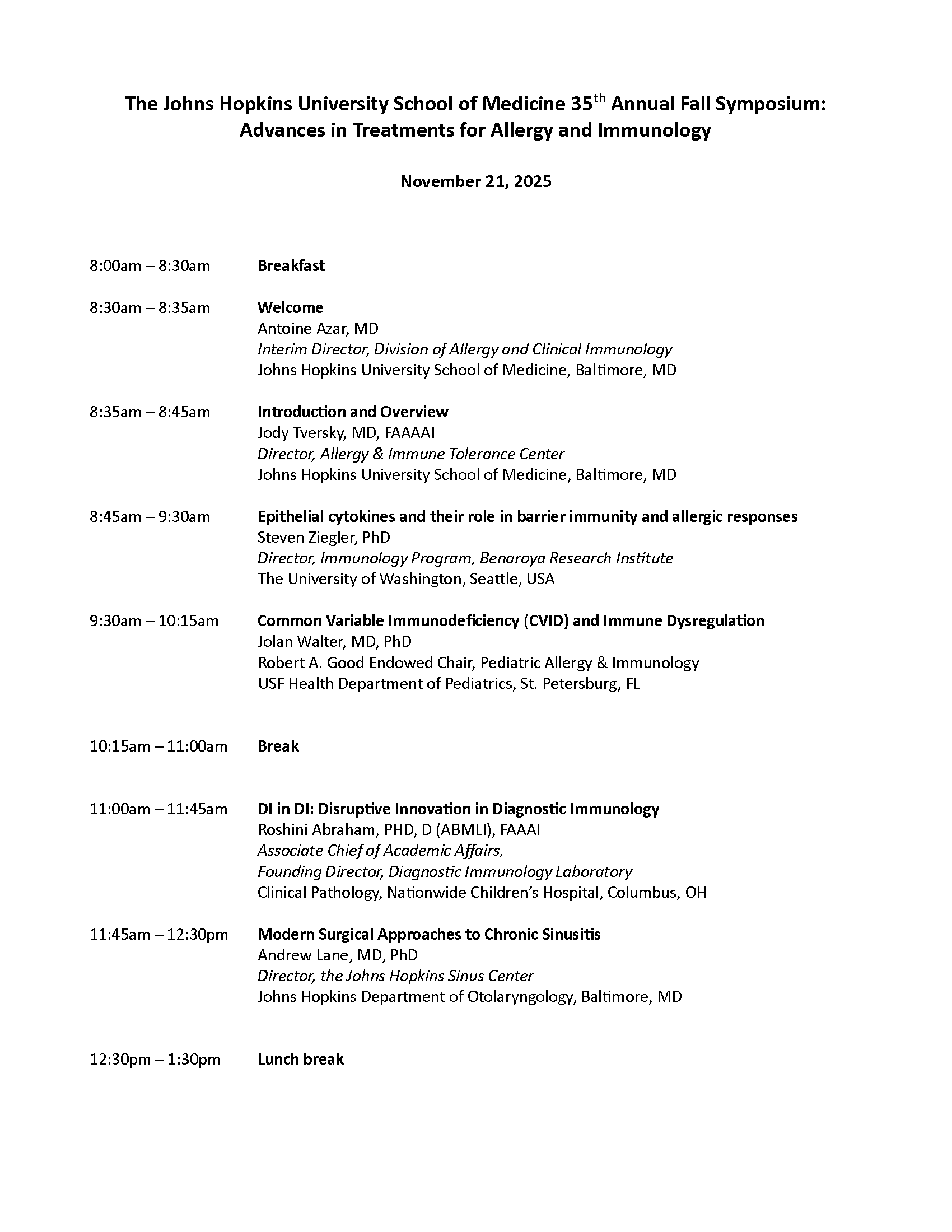 Please join us on Friday, November 21, 2025 at the Johns Hopkins Bayview Allergy and Asthma Center Auditorium for our Annual Allergy and Clinical Immunology Fall Symposium titled: Advances in Treatments for Allergy and Immunology